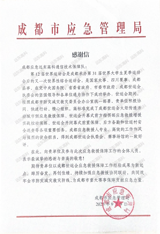 赛后,成都市应急管理局专门发来感谢信,对远东高科在世运会期间的表现予以高度肯定。